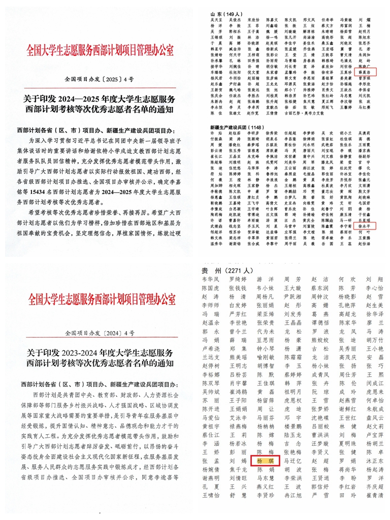 近日,全国大学生志愿服务西部计划项目管理办公室印发《2024-2025年度大学生志愿服务西部计划考核等次优秀志愿者名单的通知》和《2023-2024年度大学生志愿服务西部计划考核等次优秀志愿者名单的通知》,我院西部计划志愿者徐永平、薛晨浩、杨琪获评全国西部计划考核等次优秀。
