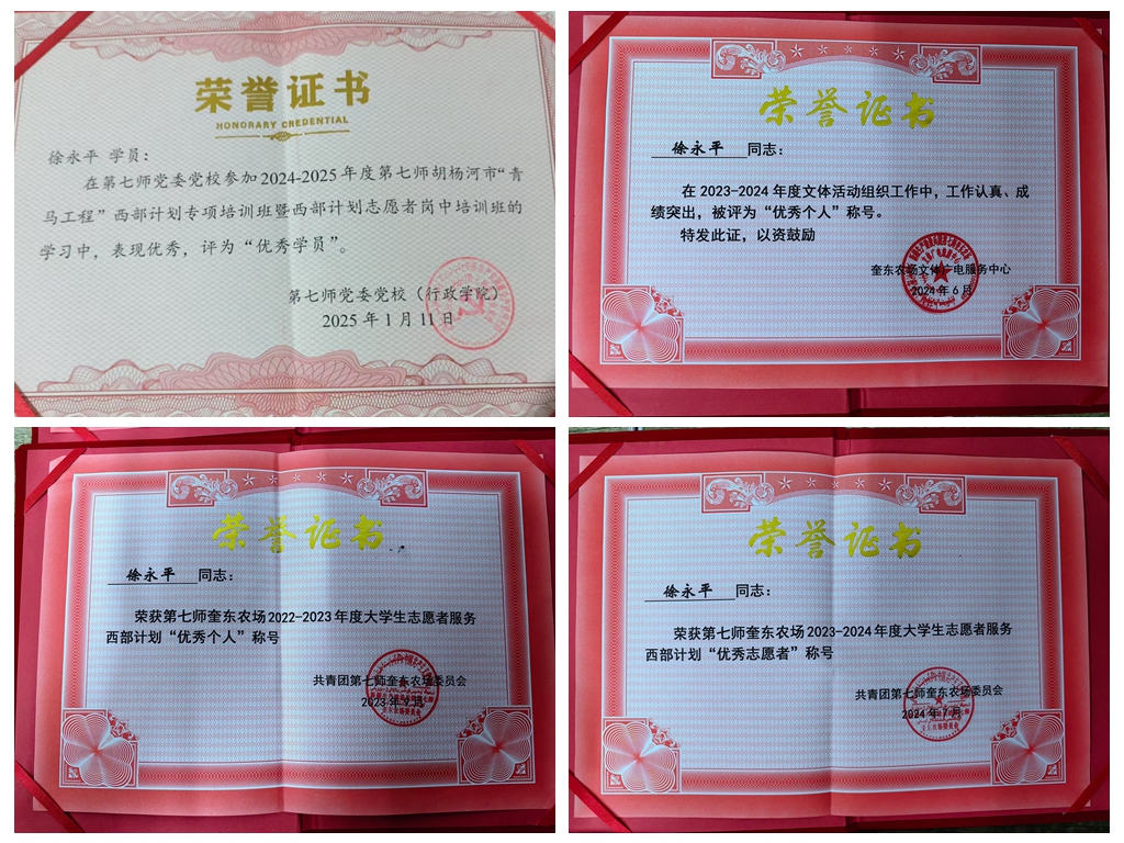 徐永平,国际贸易系2019级国际贸易实务1班学生,在校期间,她勤奋刻苦,敢于担当,先后担任班长、系学生会主席和院学生会主席等职务,参与学院庆祝建党一百周年系列活动和第十六、十七届大学生文化节、第三届跨国公司领导人青岛峰会志愿服务等各类活动,曾荣获“2020年度山东省高等学校优秀学生”“山东省普通高等学校2022届优秀毕业生”省级荣誉称号,多次荣获学院“优秀班干部”“优秀共青团干部”“三好学生”“优秀志愿者”“优秀学生干部”“优秀团干部”等荣誉称号。2022年参加西部计划,服务于新疆生产建设兵团第七师胡杨河市,2022年7月至2024年8月,在第七师奎东农场文体广电服务中心负责组织各类文体活动、宣传、公众号运营等工作,2024年8月至2025年8月,在伊犁哈萨克自治州奎屯河流域水利工程灌溉管理处综合管理科,从事行政事务、宣传联络、民生保障等工作。服务期间曾获国家级、兵团级、师市级、团场级“优秀志愿者”“优秀个人”“优秀学员”等称号,组织参与各项师市文体活动,多次获师市级二、三等奖、优秀组织奖,在服务单位均考核定等优秀。