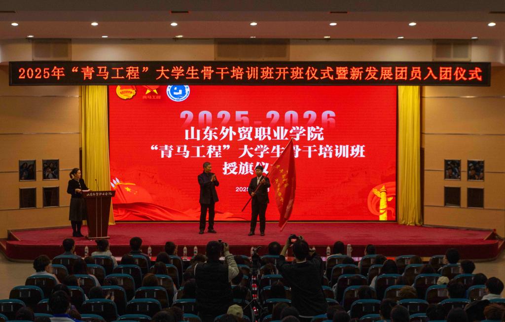 仪式在庄严的国歌声中拉开帷幕。团委书记刘嵩宣读开班通知,党委副书记黄维向本次“青马工程”培训班学员授旗,5支暑期社会实践团队代表作2025年暑期三下乡社会实践分享。随后,新发展团员入团仪式上,团委副书记刘婷婷宣读2025年下半年新发展团员名单,各系团总支书记为新发展团员代表颁发团员证并佩戴团徽。在优秀团员代表梁若涵同学的领誓下,新发展团员和本期青马工程学员面朝团旗,共同宣誓。新发展团员代表滕新祯和优秀团员代表马有福分享了自己的入团初心和奋斗经历,号召同学们砥砺品格、锻炼本领,让青春在实践中绽放绚丽光彩。仪式在齐声奏唱团歌中落幕。