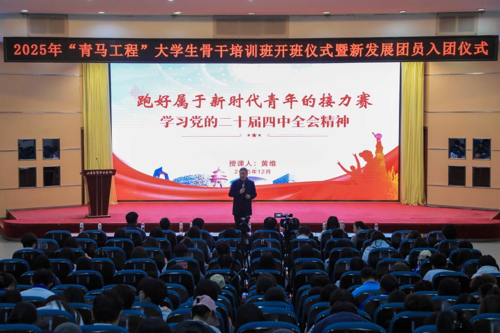 仪式结束后,党委副书记黄维以《跑好属于新时代青年的接力赛》为题开展第一次授课。授课中黄维围绕党的二十届四中全会的重要地位和深远意义、“十五五”规划的重要原则和战略部署,以及在推进中国式现代化进程中青年的责任担当等方面作了系统而深入的阐释。课程最后,黄维将学生发展与国家“十五五”规划相结合进行阐述并对同学们提出希望:要以信仰之基把稳青春之舵,自觉把个人理想融入国家发展大局。一是以过硬本领夯实成才根基,做强国复兴的担当者。二是以创新创造激发青春活力,做开拓实践的先行者。积极投身双创项目,让创新成为青春远航的持久动力。三是以品德修为涵养高尚情操,做“三观”正确的领头者。四是强化责任担当,严守纪律底线,做院系、师生的联结者。团学干部必须摒弃“青年官”思想,要坚定“青年友”意识,保持和增强与广大同学的密切联系。新发展团员要努力成为一名优秀的共青团员,在全面完善、提升自己的基础上,积极向党组织靠拢,接受更高更严的考验,争取早日成为一名光荣的中国共产党员。