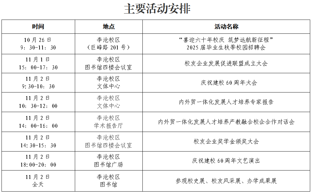 校庆期间,将组织一系列交流活动,回顾办学历程,总结办学经验,凝聚广大师生、海内外校友和社会各界力量,薪火相传共襄发展伟业,继往开来再谱时代华章。